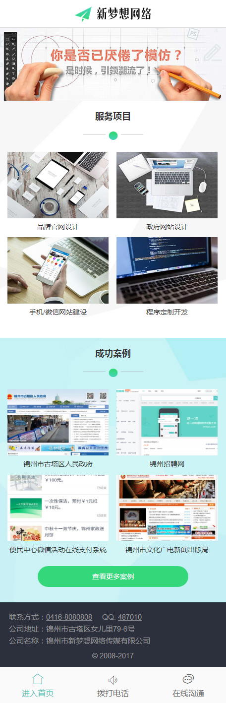錦州市新夢想網(wǎng)絡(luò)傳媒有限公司成立于2008年,是立足于錦州的專業(yè)互聯(lián)網(wǎng)服務(wù)提供商,也是覆蓋遼西五市的互聯(lián)網(wǎng)企業(yè)。致力于為事業(yè)單位、政府機(jī)關(guān)、企業(yè)提供網(wǎng)站建設(shè)、微信平臺搭建、軟件開發(fā)和企業(yè)大型商務(wù)活動的策劃等服務(wù)。